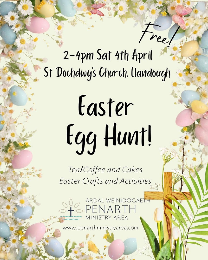Join us for a free Easter Egg Hunt at St Dochdwy’s Church on Easter Saturday. We’ll have Easter crafts and activities as well as tea, coffee and cakes. Everyone welcome for an afternoon of fun! Children should be accompanied by an adult.